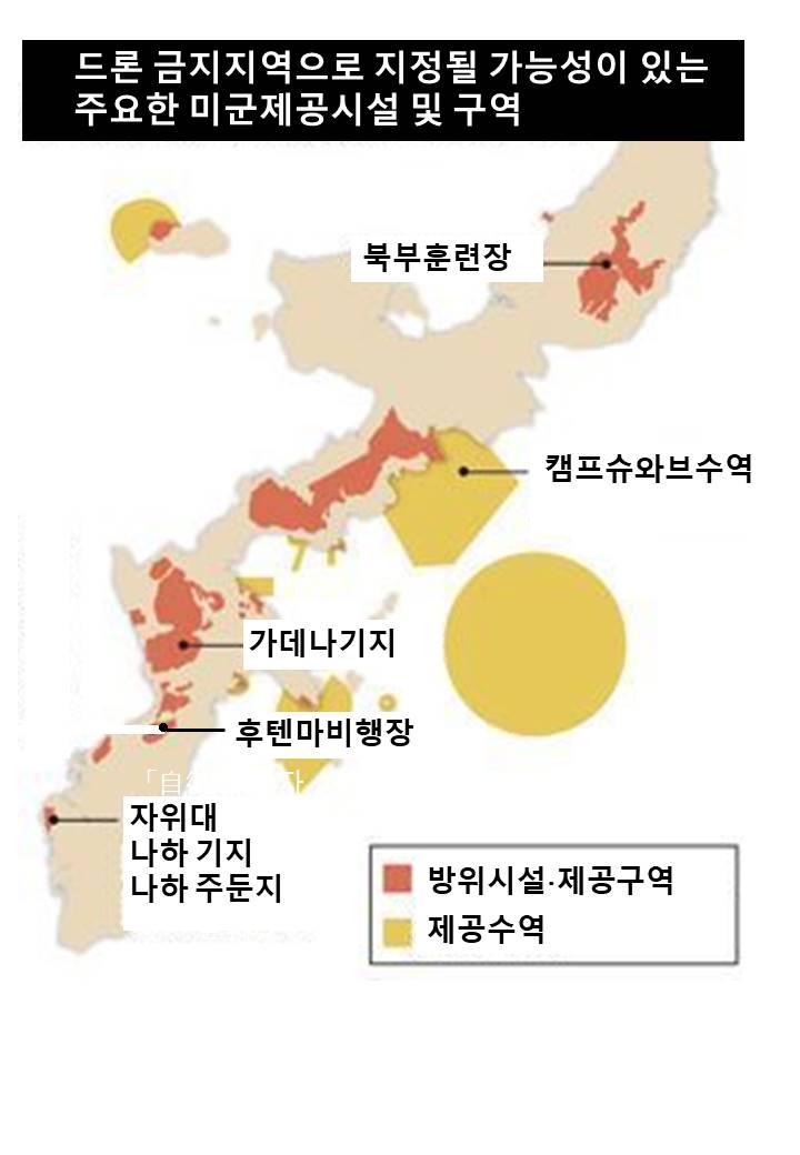 지난 주, 여당에 의해 강행으로 성립된 드론규제법에선 미군기지 주변 300미터 이내에서의 드론 비행은 미군의 허가 없이는 실시할 수 없게 되어, 실질적으로 금지됐다. 더우기 캠프 슈와브 주변엔 미군 훈련용의 광대한 제공수역(提供水域)이 있어, 이곳도 드론규제법의 대상이 된다. 그야말로 기지 건설의 허술한 공사 실태를 국민으로 부터 은폐시켜, 비판을 피하려는 악랄한 규제법이다.