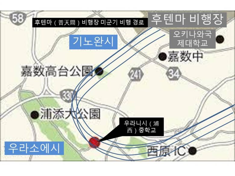 5일 미군 후탠마 비행장 가까이 있는 우라니시(浦西)중학교로 떨어진 고무 제 부품이 미군기 물건이라고 해병대가 인정했다. 이 물건은 후텐마 비행장 소속 CH53E헬기의 프로펠러에 붙인 고무제 테이프고 무게가 20그램이다. 2017년 연말에는 후텐마 기지 주변 초등학교와 유치원에 부품이 낙하한 사건이 잇따른 바가 있고 이번에도 중학교의 교정에 낙하했기 때문에 오키나와현민들에게 큰 불안감과 분노를 일으키고 있다. 5일, 오키나와현과 우라소에시(浦添市)는 동형 헬기의 비행 정지를 일・미 정부에 요청했다.