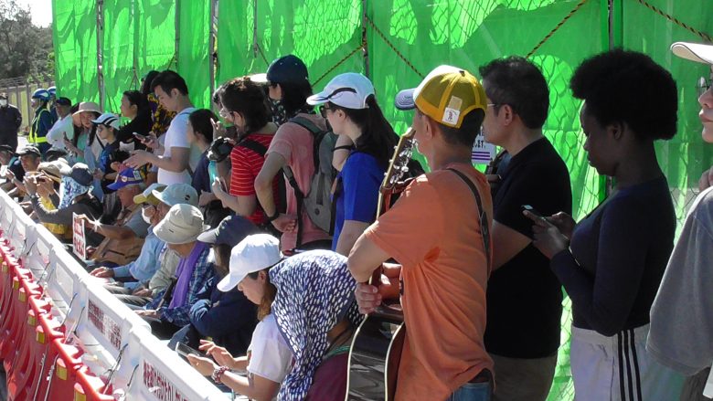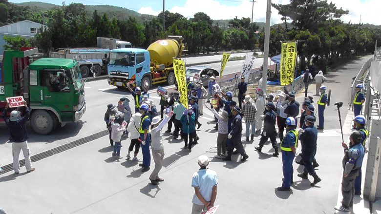 싱가폴 대학의 학생들 18 명, 도쿄 · 사이타마의 ‘헌법 9 조를 위한 모임’의 유식자 10 명도 농성에 참가해서 공사의 현황에 대한 설명에 진지하게 귀를 기울이고 있었다. 나하시 출신의 배우 쓰카야마 마사네 (津嘉山正種 75) 씨도 오키나와 텔레비전의 스페셜 프로그램 촬영을 위해 함께 연좌농성을 했다. 시민들이 속속 기동대원에 의해 끌려나는 모습을 보고 津嘉山 씨는 “뭐라 말할 수 없는 기분이다. 인권도 헌법도 무시하는 일본 정부에 대해 분노를 금할 길이 없다. 자식이나 손자를 위해서도 기지 건설에 절대 반대 “라고 분노를 드러냈다.