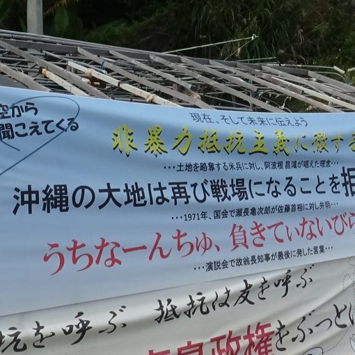 아침 9시, 따가운 뙤약볕 아래 약 50명이 게이트 앞에서 연좌시위를 시작했다. 어제부터 K8호안을 사용해 토사 양륙을 시작한 것에 게이트 앞에서는 분노의 발언이 잇따랐다. 기지 안에서 기동대가 출동하면 “오우라만을 파괴하는 공사에 가담할 것인가” “민의(民意)를 무시하지 마라. 현민을 적으로 삼는 건가”등 고성이 쏟아졌다. 기동대원들은 귀를 막은 것처럼 눈 하나 깜짝하지 않고 항의하는 시민들을 한 명씩 끌어냈다. 덤프 트럭의 정체가 1킬로미터 이상 됐다. 30분 남짓 전원 해산당해 자재를 실은 차량이 기지 안으로 들어갔다. 오전오후 세 번에 걸쳐 174대가 자재를 반입했다.