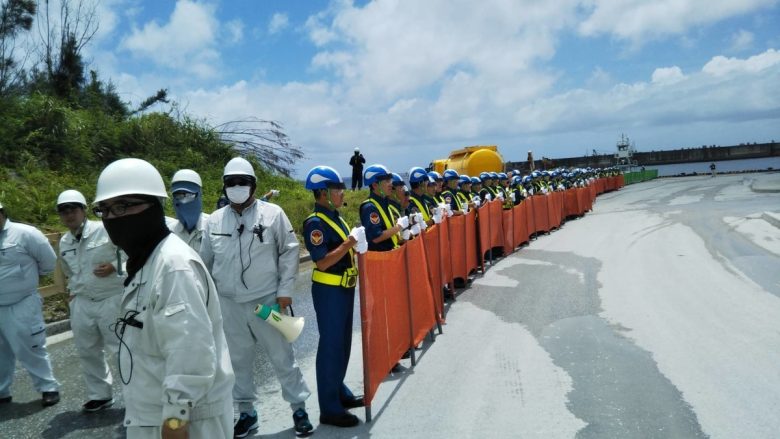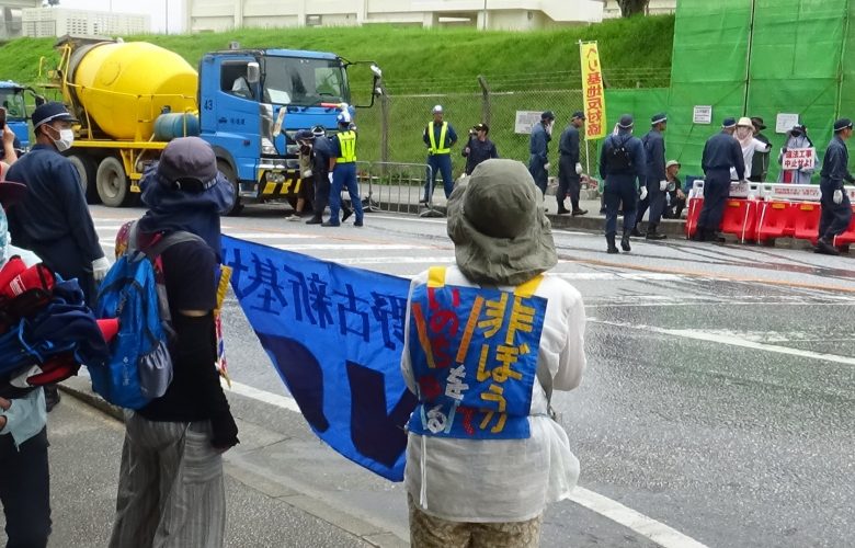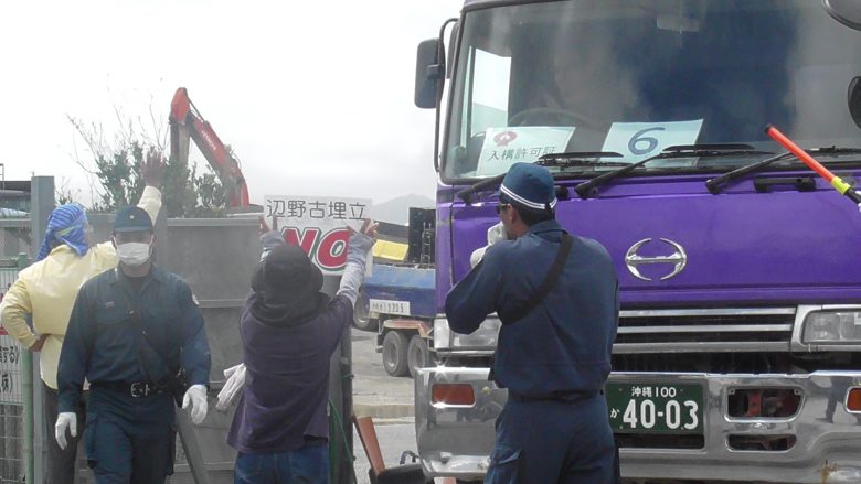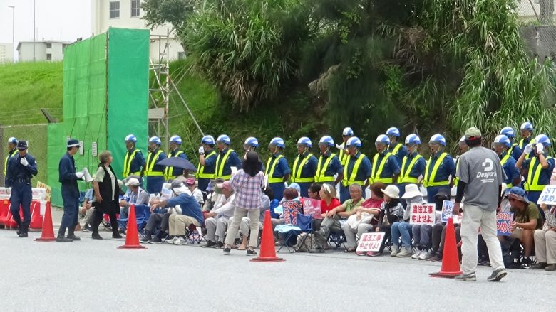 본격적인 더위가 시작됐다. 어제에 이어 도쿄에서 온 젊은 토건 조합원20명을 포함한 45명이 아침 9시부터 연좌시위를 시작했다. 햇살이 강하다. 앉아 있기만 해도 땀이 솟는다. 긴소매의 제복을 몸에 두른 기동대원들이 덤덤하게 시민들을 해산시킨다. 기동대원들도 상당히 고될 것이라는 생각이 든다. “위법공사 중단하라!” “토사를 바다에 넣지 마라!”라고 구호를 되풀이하지만, 약30분 만에 시민 전원이 해산됐다. 3번에 걸쳐 총 142대의 차량이 자재를 반입했다.