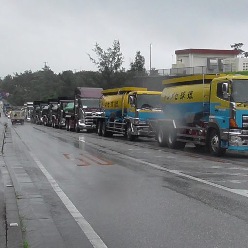 폭염 속에서 약 30 명이 게이트 앞 연좌 농성. “오우라만(大浦湾)을 파괴하지 말라.” “신기지 반대의 민의가 드러났다”라고 구호를 반복했다. 도로 반대쪽에서는 의료 노조 간호사 몇명이 지키고 있다. 실제로 매년 수십 명이 더위로 인해 컨디션 을 해쳐 치료를 받지만 그래도 또다시 항의에 나온다. “아이들을 위해 후손을 위해 기지건설은 기필코 막겠다” 라는 강한 의지가 이들을 게이트 앞으로 모이게 하는 것 같다. 믹서 트럭과 덤프 등 157 대가 기지에 들어갔다.