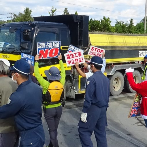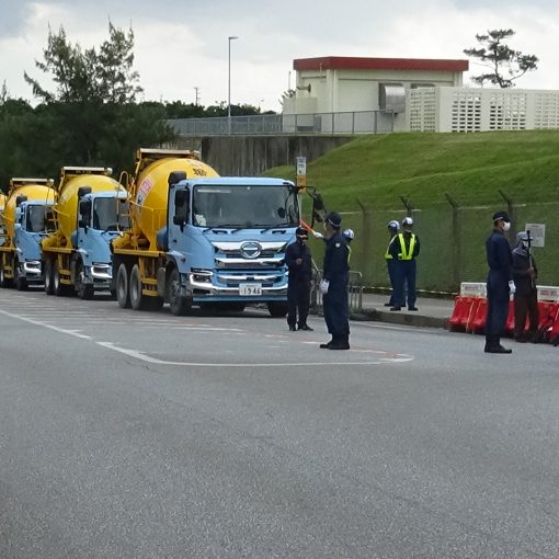 캠프 슈워브 공사 게이트 앞에서는 오사카에서 달려온 젊은이 10명이 항의 시위에 참가했다. 피켓을 들고 자재를 반입하는 덤프트럭을 향해 “적토(赤土)로 바다를 파괴하지 마라” “지금 당장 불법 공사를 멈춰라”라고 목소리를 높였다. 덤프트럭 33대가 자재를 반입했다.