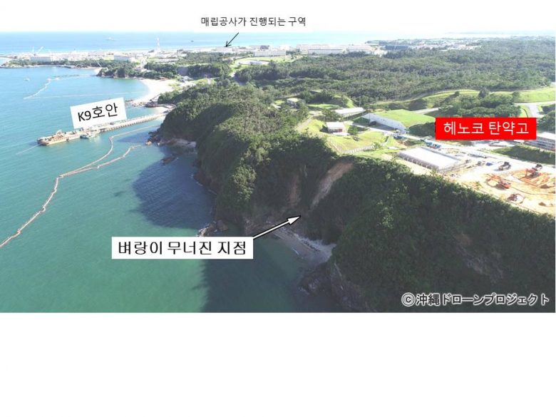 오키나와 드론 프로젝트의 조사로 캠프 슈워브 안에 있는 헤노코 탄약고 근처 벼랑이 무너진 게 밝혀졌다. 사태(砂汰) 규모는 높이30미터, 너비가 15미터에 달하고, 적토가 바다로 흘러나간 게 확인되었다.