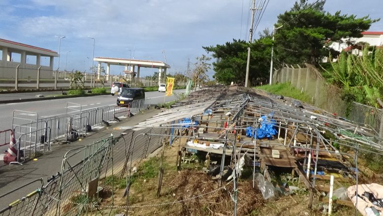 태풍 18 호 때문에 다시 공사가 멈췄다. 오전에 2 번, 트럭믹서 등 48대가 기지에 들어가서, 그 것으로 종료. 오키나와 외에서 처음으로 온 사람들은 “분발하고 농성에 왔는데, 조금 유감. 작업이 없는 것은 좋은 일이지만” 이라고 쓴웃음을 했다.태풍이 올 때마다 농성 텐트는 지붕의 블루 시트를 정리 작업에 쫓겼다. 올해 5번째다. 태풍으로 공사가 멈추는 것은 만만세이지만, 이 작업은 상당히 힘들다.