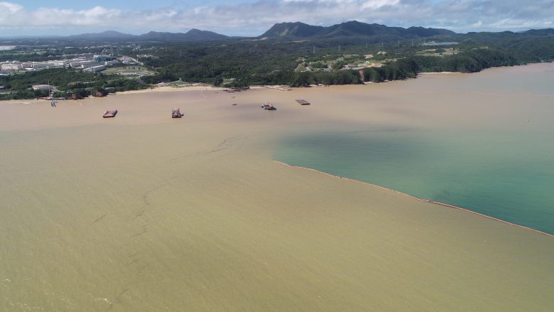어제 아침에 내린 큰비로 인해 오우라만 바닷가 세다케(瀬嵩)마을 앞 바다에 적토가 유출해 흙탕물이 크게 펼쳐져 있는 것이 확인됐다. ‘오키나와 드론 프로젝트’가 조사를 했다. 산호에게 큰 영향을 미친 적토의 해역 유출은 오키나와 현 조례로 엄격히 규제되어 있다. 지금 방위국이 진척시키는 헤노코 쪽 매립 공사에서도 오탁방지막을 넘어 적토가 유출되어 있는 것이 몇 번이나 확인됐다. 토목 전문가는 “해저까지 닿지 않는 오탁방지막이라면 아무 의미가 없다. 명백히 현 조례에 어긋나다.”고 가차없이 지적한다.
