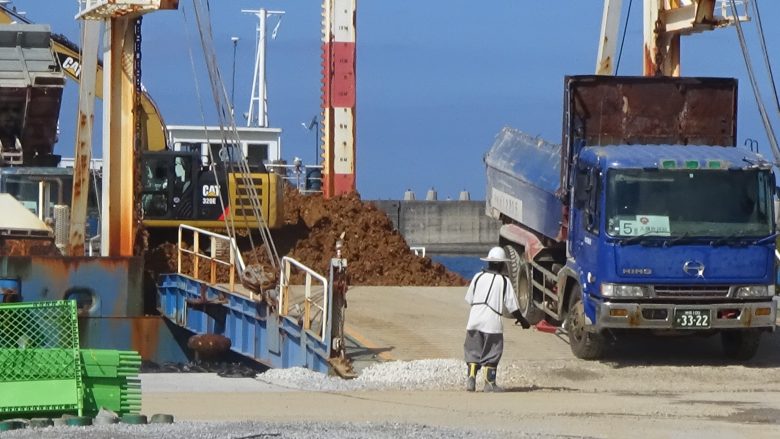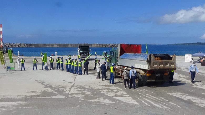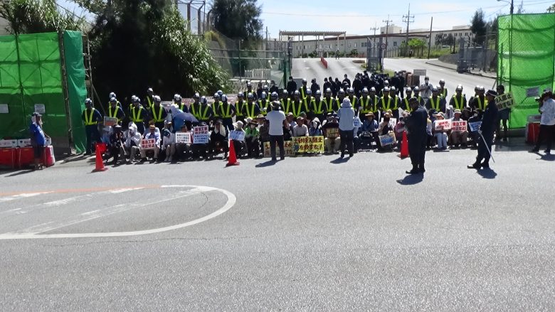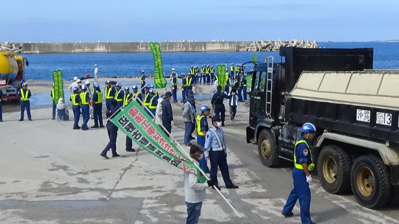 아와에서 토사 반입은 없었다. 방위국은 우리가 5일 연속 진행될 대행동에 대비하여 이미 부지 안에 높이 5미터 가량 쌓아 올린 토사가 있으니 소용에 닿겠다고 어림잡고 있는 것인가? 시오카와에서는 일주일만에 어제부터 토사 반입이 시작되었다. 이날은 아침7시부터 덤프트럭이 잇달아 나타났다. 채석장에서 가까운 만큼 덤프트럭의 왕래가 빈번하다. 오전에는 ‘오키나와 평화 시민 연락회’회원 여남은 명이 3군데의 출입구에서 과감하게 덤프트럭의 앞을 가로막아 운행을 억제했다. 작업은 5시가 지남까지 계속되어 365대가 토사를 반입해 운반선 2척이 출항했다. 도쿄에서 참가한 한 여성은 “시오카와항에서 바라보는 바다는 파랗게 보여서 정말로 아름답다. 이 항구에서 바다를 파괴하는 토사가 반출된다고 생각하면 배겨낼 수 없는 느낌이 든다.”고 이야기했다.
