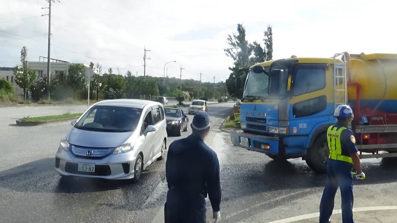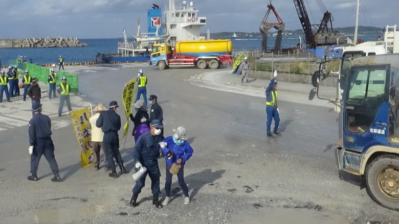우루마의 시마구루미 멤버 15명이 기동대가 오는 9시 20분까지 약 2시간 가량 덤프의 토사반입을 막았다. 그 후로는 시민 한명에 기동대원 2명이 들러붙었으나, 부두 구내를 계속 돌고 움직이며 항의행동을 하여 덤프의 운행을 늦췄다. 344대가 토사를 반입했다.