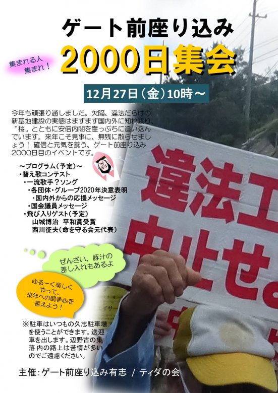 이번주 27일 (금), 게이트 앞에서의 연좌항의행동은 2000일째를 맞이한다. 2014년 7월 7일부터 약 5년 5개월. 시작된 당초는 10명여 였으나, 지금은 100명을 넘는 때도 빈번하다. 신기지건설반대를 호소하는 오키나와의 목소리는 바야흐로 국내외에 퍼져, 본토 뿐만 아니라 세계 각국에서도 지원과 취재로 방문하는 사람들이 많아졌다.