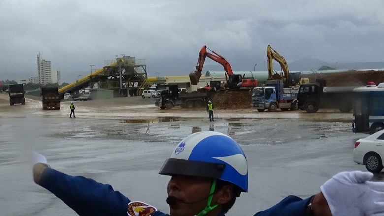 일본 정부가 갑자기 정책을 변경하고 매립 토사를 일본 본토가 아니라 오키나와 현내에서 조달한다고 발표했다. 또한 연약 지반의 개량 공사에 필요한 바다모래 350 만 ㎥ 도 오키나와현 내 조달을 검토하고있는 것을 밝혔다. 오키나와현의 ‘토사 조례’ 규정이 엄격하기 때문에 공사 장기화를 우려해서 지금까지의 설명을 바꾼 것이다.