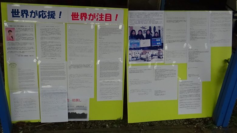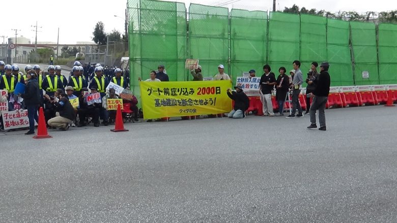 2014 년 7 월에 시작된 게이트 앞 연좌 농성은 이날 2000 일을 맞이했다. 게이트 앞에 ‘티다’ (오키나와말로 태양)의 모임과 유지들이 중심이 되어 ‘연좌 농성 2000 일 집회’가 열렸다. 이나미네 수수무(稲嶺進) 전나고(名護) 시장과 오오시로 요시타미(大城敬人) 시의원, 최고령 시마부쿠로 후미코(島袋文子) 씨 (90 세) 등 약 100 명이 참가했다. 국내외로부터 지원 메시지를 받았다. 사회자가 “오키나와의 투쟁에 세계가 주목하고 오키나와의 투쟁이 세계를 격려하고 있다”고 보고해서 큰 박수가 끓었다.
