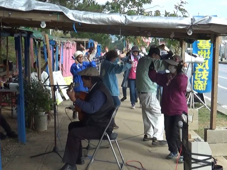 오후는 돼지 고기 된장국이나 단팥죽 등이 제공되고, 오키나와 인기 가수, 우미세도 유타카(海勢頭豊) 씨의 노래로 ‘카챠시’(오키나와 전통 춤)을 췄다. 마지막에 참가자 전원이 기지를 향해 “아베 정권 타도하고 내년에 새로운 기지를 단념시키자”고 구호를 외쳤다.