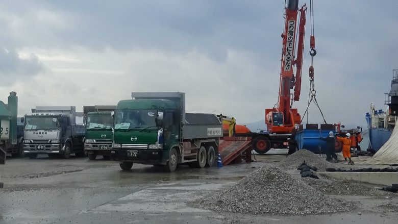 덤프가 직접 바지선에 토사를 싣는 일반적인 형태와 달리 이날은 토사를 부두에 한번 놓고 크레인으로 운반선에 싣는 작업이 되었다. 부두 사용 허가 신청에 운반선을 사용한다는 기재가 있고 그 실적을 만들기 위해 어쩔 수 없이 이 형태를 취하고 있다고 한다. 가동중인 27 대 덤프의 절반 정도가 상시 토사를 실은 채 대기하는 상태가 되었다. 토사 반입 덤프는 68 대에 급감했다.