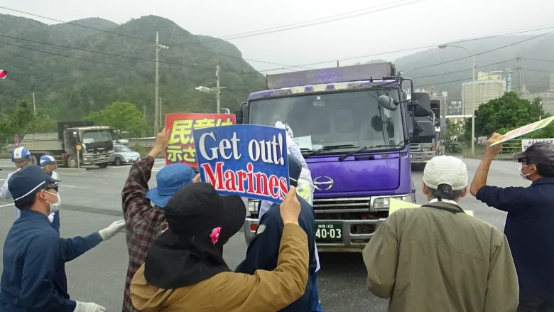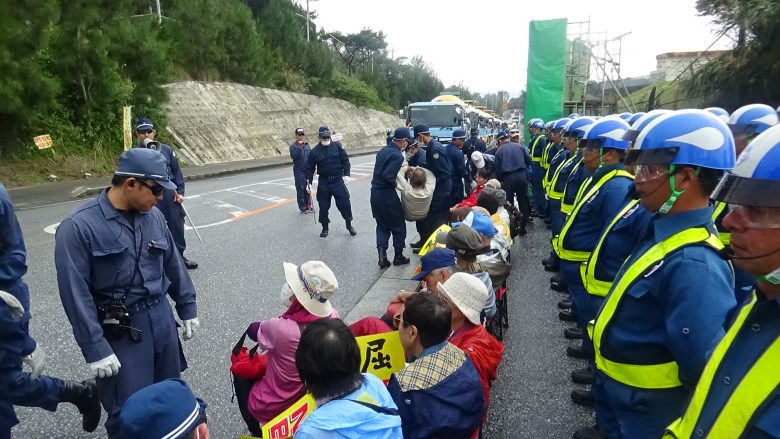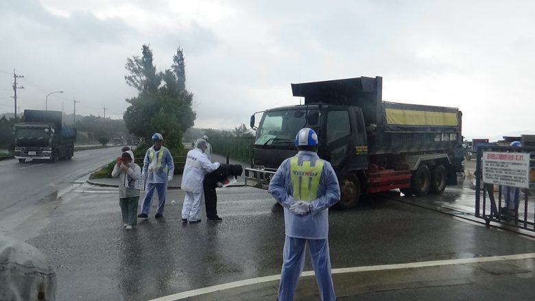 아침 9시 항의를 하기 위해 연좌 농성한 멤버는 불과 12 명. 어제 (제 3 목요일 행동 날) 는 250 명이니까 그 낙차는 너무 크다. 10 분 정도로 간단하게 배제되어 버렸다. 오전 오후 세 차례에 걸쳐 총 183 대가 자재를 반입했다.