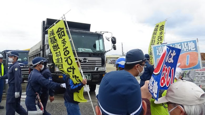 출구 부근에서 시민과 GoGo 드라이브의 멤버가 토사를 하역하고 나오는 덤프트럭을 향해 격렬하게 저항하여 한동안 대부분의 덤프차가 나룻터 안에 갇히게 되었다. 난감하게 된 방위국은 토사 반입을 1 시간 가량 중단했다. 오전 중에는 덤프차 수를 대폭 줄일 수 있었다. 오후에도 사람과 차량으로 끈질기게 덤프차의 운행을 방해했다. 토사 반입은 저녁 7시 이후에까지 이어져 603대가 토사를 운반해 넣었다.