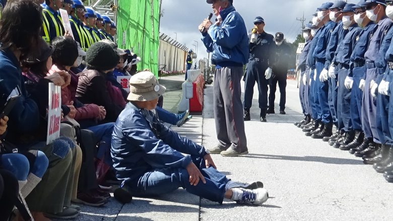 아침 8시 30분, 차가운 공기 속에 땅바닥에 주저 앉은 것은 불과 16 명. 어제는 100명을 넘었기에 이 한동안은 참가자 수의 변동이 심하다. 그러나 사람수가 적다고 낙담치는 않는다. 정의는 우리들 편에 있기 때문이다. 기동대원이 나란히 줄을 섬과 동시에, “위법 공사에 가담하지 말라”, “우치난츄 (오키나와 사람) 로서 부끄럽지도 않느냐” 등 고함소리가 날아든다. 대원들은 표정도 바꾸지 않고 서서 있을 뿐. 10분 정도에 항의자들이 전원 배제되어 레미콘 차량이 속속 게이트 안으로 들어갔다. 12시, 3시에도 반입이 진행되어, 총 208대가 자재를 반입했다.
