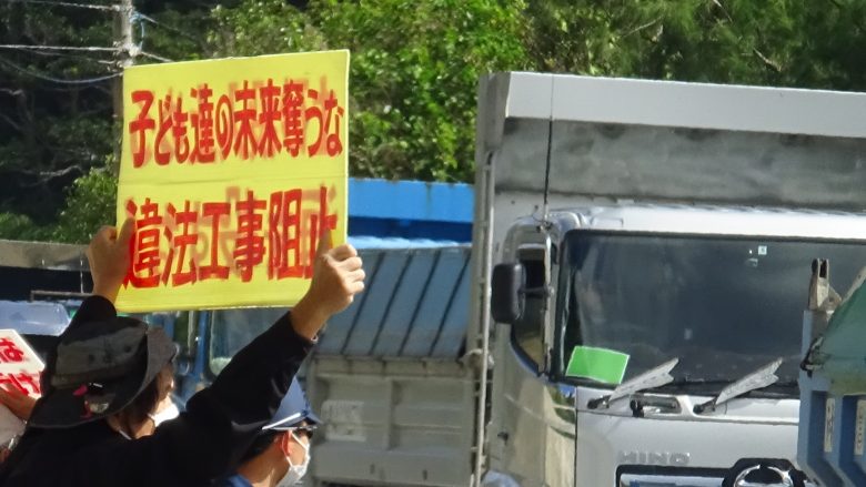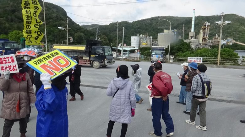 나하에서 온 평화 시민 연락회 멤버들 약 40 명이 나루 출입구로 나뉘어 항의를 계속했다. 덤프차량이 도로의 양쪽으로부터 오기 때문에 몸을 쉴 틈도 없다. 신호가 바뀔 때마다 서너 대가 나룻터 안으로 들어갔다. 그래도 1 분 1 초라도 반입을 늦추려고 하루 종일 항의 시위를 계속했다.