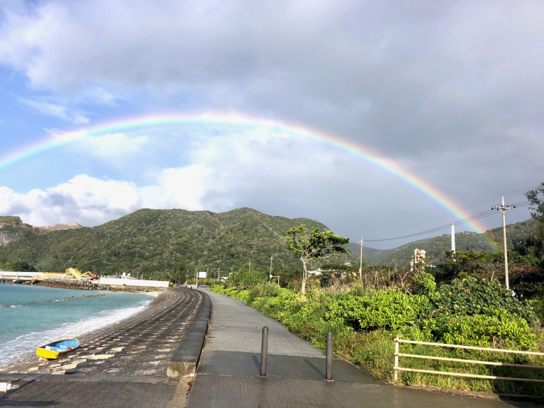 카누 멤버도 8정 바다로 나가, 나루 밑에서 그물로 카누를 묶어 저항. 첫 1척의 출항을 30분 정도 지연시켰다. 덤프차 712 대분의 토사가 운반선 2 척에 실려, 오우라만을 향해 출항했다. 사진은 아침 아와해안가에 걸린 무지개. 뭔가 좋은 일이 일어날 것 같은 징조?