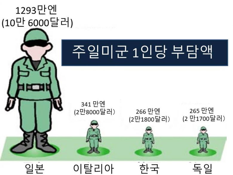 신문 보도에 의하면 일본 정부가 주일미군 주둔 비용에 대해 ‘배려’로서(법적 근거 없이) 부담하고 있는 금액은 다른 나라에 비해 단연히 많은 것이 알려졌다. 미국 정부가 동맹국인 27개국을 대상으로 한 조사 보고에 따르면, 일본이 부담하는 주일미군 주둔 비용의 금액은 2019년에는 1974 억엔에 이르러 한국이나 이탈리아, 영국의 5배에서 20배로 불어나고 있다. 주일미군에 대한 ‘배려’는 원래 부담할 의무가 없는 군 내 민간인 노동자의 노무비, 광열 수비, 훈련비뿐만 아니라 미군 가족 전용 호화로운 주택이나 부대 안에 있는 오락 시설까지에 이르고 있다. 주일미군 1인당으로 환산하면 일본은 1293만엔으로 이탈리아나 한국의 3.8~4.8배나 된다. 미군 주둔비용의 부담 비율도 일본은74.5%로 최대다. 한국은40%, 독일은32.6%가 되어 있다.