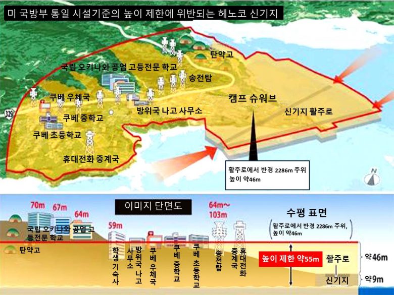 신기지 건설해안 장소 근처에 오키나와공업고등전문학교가 있다. 직선 거리로 불과 2㎞. 미국이 정한 비행장 건설의 안전 기준으로 보면 헤노코에 비행장은 짓지 못할 것이다. 그러나, 미일 정부는 기준의 “적용 외」라고 자처하며 억지로 기지 건설을 밀어부치고 있다. 정부 자신이 무법을 자처하고 있는 것이다. 그 학교의 뒷면 300m에 미군 헬기가 이착륙 훈련을 하는 헬기장이 있어, 학생들은 소음에 시달리고있다. 게다가 미국이 정하는 활주로 주변 높이제한에 있어서도 학교는 뻔히 “위험한 높이”에 있다. 학교는 이중삼중으로 있을 수가 없는 상태를 면치 못하고있다. 이런 것은 미국 내에서는 허용되는 일일까.