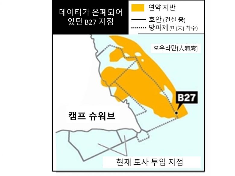방위성이 또한 중요한 데이터를 은폐하고 있었던 것이 밝혀졌다. 오우라만[大浦湾] 지반 조사로 수심 70m보다 깊은 지층의 데이터가 있음에도 불구하고 숨겨왔던 것이 밝혀졌다. 방위성은 지반 개량 공사를 하기 위해 불편한 진실을 설계 변경에 반영하지 않고 다른 지점의 데이터를 바탕으로 신기지 지반의 안정성을 확보할 수 있다고 설명해 왔다. 이번에 밝혀진 업체의 보고서에 따르면 조사 지점 ‘B27’수심 70m ~ 90m는 “마요네즈 수준”이라고 불리는 강도. 그러나 방위성이 채택한 데이터는 ‘B27’지점에서 150 ~ 750m 떨어진 지점이었다.