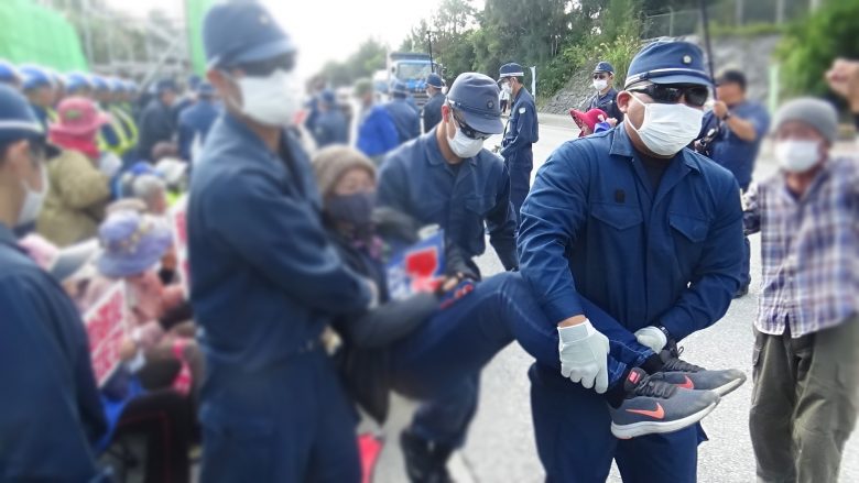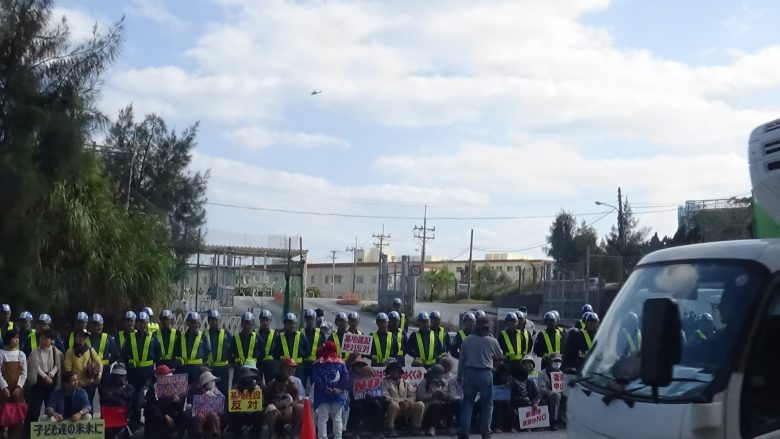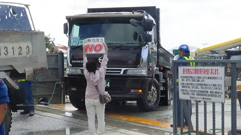 “앉읍시다!” 야마시로 히로지 씨가 외쳤다. 위험한 덤프트럭의 운행을 멈추게 해야 한다는 의사표시다. 10여 명이 앉았다. 이를 본 기동대원, 방위국 직원은 당황해 구내 안으로 들어갔다. 좌회전하려던 덤프트럭은 차례차례 되돌아갔다. 과연 야마시로 씨라고 해야 할까. 이후 좌회전하는 덤프트럭은 한 대도 없었다. Go Go 드라이브의 멤버 10대도 연좌 농성자들과 함께 덤프트럭을 막아냈다. 토사를 반입한 덤프트럭을 부두 안으로 밀어 넣어 어제의 절반 이하로 막았다. 490대가 임시보관소에 토사를 반입해 562대 분이 운반선 3척에 실렸다. 카누팀 ‘헤노코 블루’도 운반선에 붙어 2척의 출항을 각각 1시간씩 늦췄다.