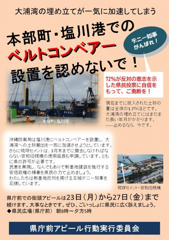 시오카와[塩川] 항과 아와[安和] 부두가 모두 오키나와현의 관리하에 있으며 엄정한 대응이 요구된다. 불법 행위를 반복하는 오키나와 방위국의 신기지 건설 공사에 대해 오키나와현이 확고한 자세로 임할 것을 기대한다. 오늘부터 현청 앞에서는 시민에 의한 “컨베이어벨트 사용 허락을 시키지 말자” 거리 어필이 시작된다. 27 일까지 계속된다.