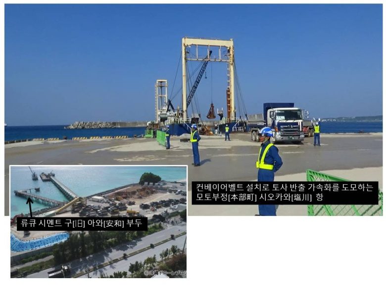 토사 반출에 상당한 지연 때문에 오키나와 방위국은 올해 1 월 시오카와[塩川] 항에서 컨베이어 벨트 설치를 오키나와현에 신청했다. 토사 반출을 빨리 하기 위해서다. 허락을 얻기도 전에 장비를 반입 하는 것은 명백한 조례 위반이다.