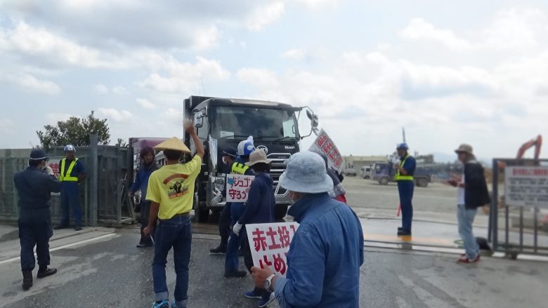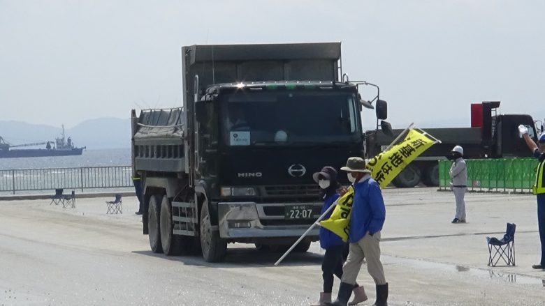5명으로 덤프차 앞을 천천히 왔다갔다하는 등, 항의 시위를 이어갔다. 382대분의 토사가 바지선 3척에 실렸다.