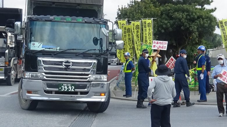 항만 구내 한 구석에 거대한 벨트 컨배이어가 놓여있다. 항만 관리자인 오키나와현의 허락 없이 토사반입 업자가 가져온 것이다. 이 것을 이용해 방위국은 토사반출 속도를 단숨에 올릴 예정이지만 이런 불법행위를 시민들이 가만히 보고 있을 리가 없다. 벨트 컨베이어 설치 반대의 가두 캠페인은 오늘도 현청(県庁) 앞에서 실시되었다. 오후에는 한 시민 단체가 시오카와항의 관리책임자인 오키나와현의 담당부서에 요청을 실시한다.