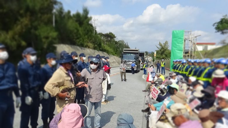 히가(比嘉)씨가 오키나와 전통악기인 산신(三線)을 치면서 오키나와 민요를 불렀다. 오키나와말로 하는 민요에는 왠지 비애가 감돈다. 기동대원들은 온순한 얼굴로 서 있었다. 그들도 어렸을 때부터 친숙해 온 음색일 것이다.
