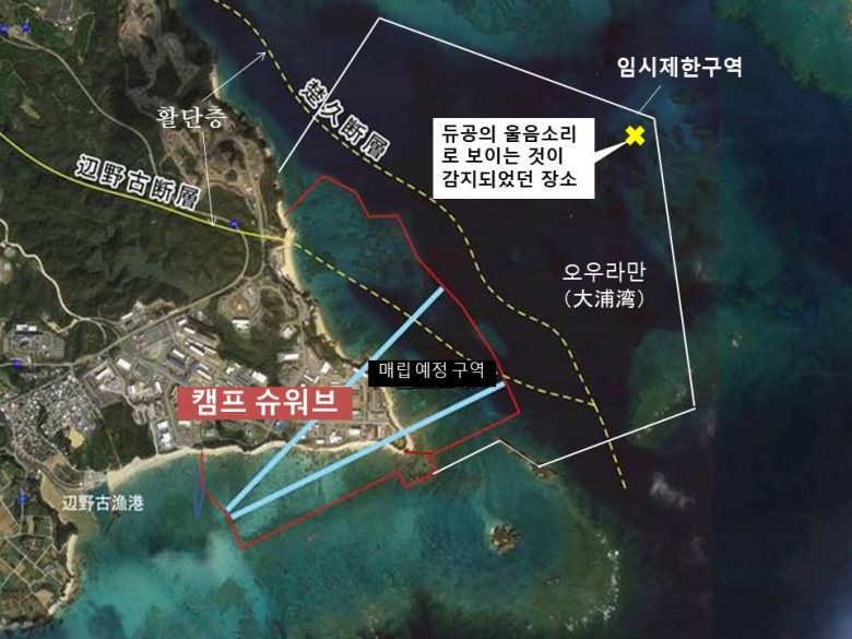 듀공이 오우라만에 돌아왔을지도 모른다. 10일, 오키나와 방위국은 공사현장에 가까운 수중에 설치한 장치에 듀공의 울음소리 같은 것이 녹음되었다고 발표했다. 울음소리가 확인된 것은 2월 11일, 23일, 24일로 모두 19건 감지되었다. 모두 공사가 진행되지 않은 휴일이나 공휴일로 장소는 건설현장에 가까운 임시제한구역 내이다. 만약 듀공의 울음소리라면 2018년 11월 이래 처음이다.