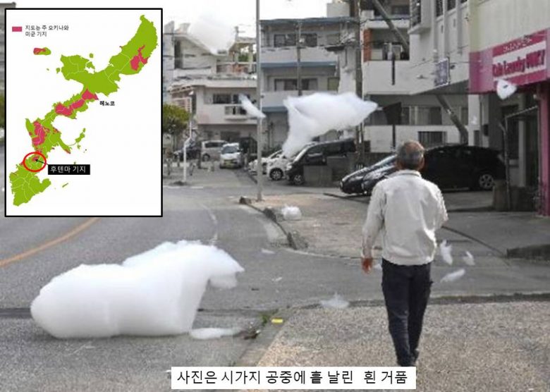 10일, 발암성이 지적되는 화학물질 과불화옥탄술폰산(PFOS)을 함유하는 포말소화제가 미군 후텐마 기지에서 시가지에 대량유출, 현민의 노여움을 사고 있다. 기지외에 흘러 나간 양은 드럼통 719개, 14만3000리터에 달하고, 흰 거품이 하천이나 논밭, 도로, 그리고 주택지나 마당을 덮었다.
