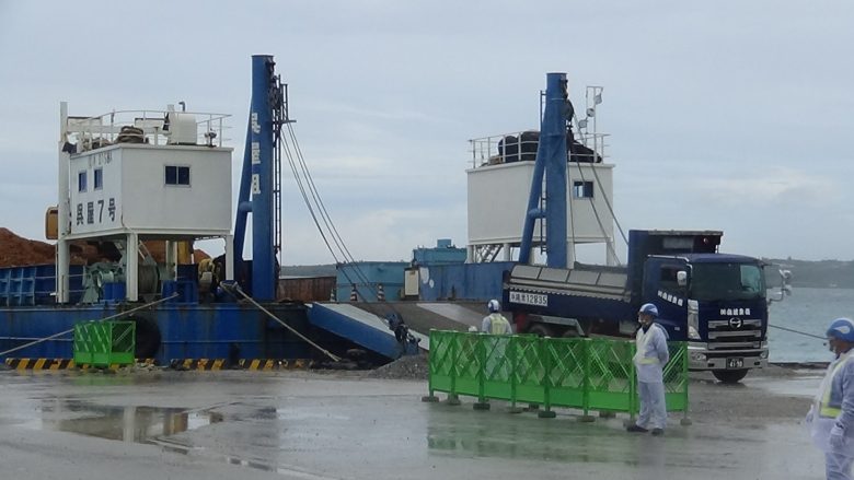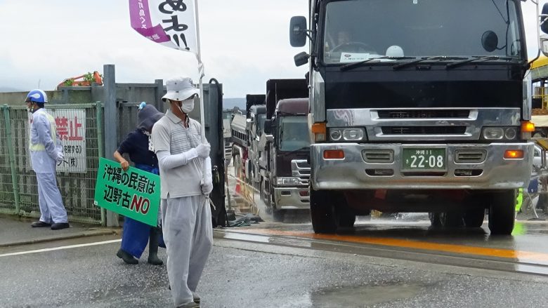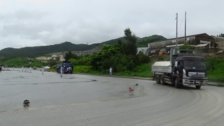 가랑비가 내리는 가운데 약 20명이 부두의 출입구에 흩어져 항의행동을 이어갔다. 코로나19 대책으로 공사가 중단되었던 것을 만회하려는 듯 토사 반입 덤프트럭의 회전이 빨랐다. 게다가 저녁 8시 가까이 작업이 계속되었다. 어제는 785대, 오늘은 1,031대분의 토사가 운반선에 실렸다.