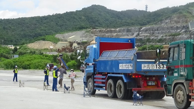 더운 햇볕 아래 약40 여명이 출입구로 나뉘어 토사 반입에 대한 항의 행동을 전개했다. 덤프가