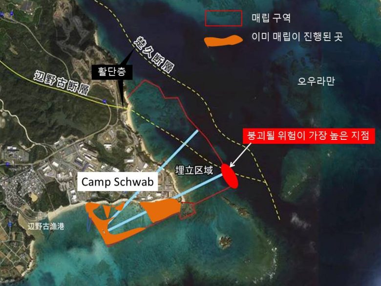 팀은 지질과 지반 연구를 전문으로 하는 대학교수들로 구성된 ‘오키나와 헤노코 조사단’은 지금까지 오우라만을 지나가는 2개의 활성단층의 존재를 발표하는 등, 신기지건설의 구조상 문제를 되풀이해 지적하고 있다. 연약지반은 미국하원국사위원회 소위원회에서도 문제시되고 있어, 아베정권은 지금까지 이상으로 엄한 추궁을 받게 될 것이다.