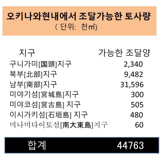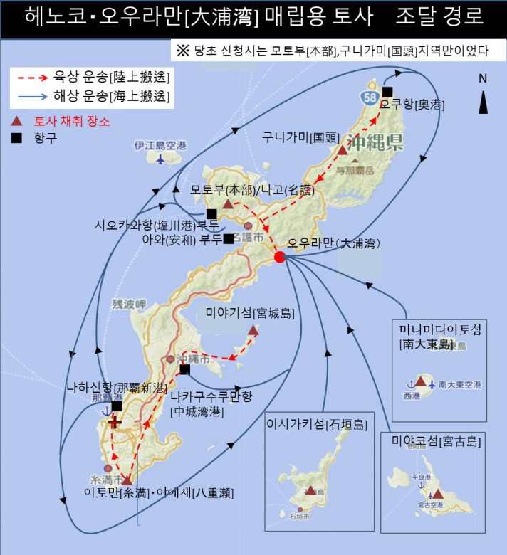 신기지 건설에 사용하는 토사 대부분을 오키나와현내에서 조달하기로 계획이 바뀐 것이 이번에 오키나와 방위국이 오키나와현에 제출한 설계 변경 신청서로 밝혀졌다. 방침의 대전환이다. 당초 신청 시에는70 % 정도 규슈[九州]와 세토우치[瀬戸内] 등 일본 본토로부터 조달, 해상 운송한다고 했지만, 외래종 침입을 엄격히 규제하는 오키나와현 ‘토사 조례’를 피하기 위해, 방침전환한 것으로 보인다.