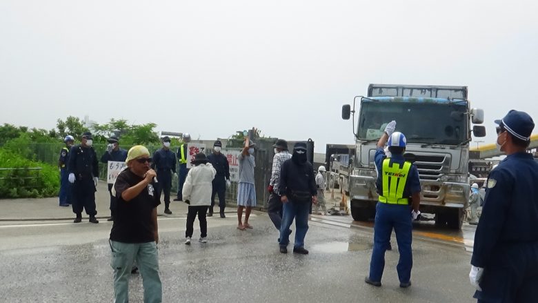 오키나와 현내에서의 코로나19 감염자 급증에 따라 ‘올 오키나와’로서의 항의 행동은 중지되었으나 캠프 슈워브 게이트 앞, 아와 부두, 시오카와항에는 각각 열 명 가량이 모여 항의 시위를 이어갔다.아와 부두에서 덤프차 828대분의 토사가 운반선에, 시오카와항에서는 442대분의 토사가 바지선에 실려졌다.항의 시위에 참가한 한 사람은 “오키나와현이 긴급 사태 선언을 발표했음에도 불구하고 왜 공사를 게속하는가? 또 기지 안에서 감염자를 나오게 할 셈인가?”라고 화를 드러냈다.