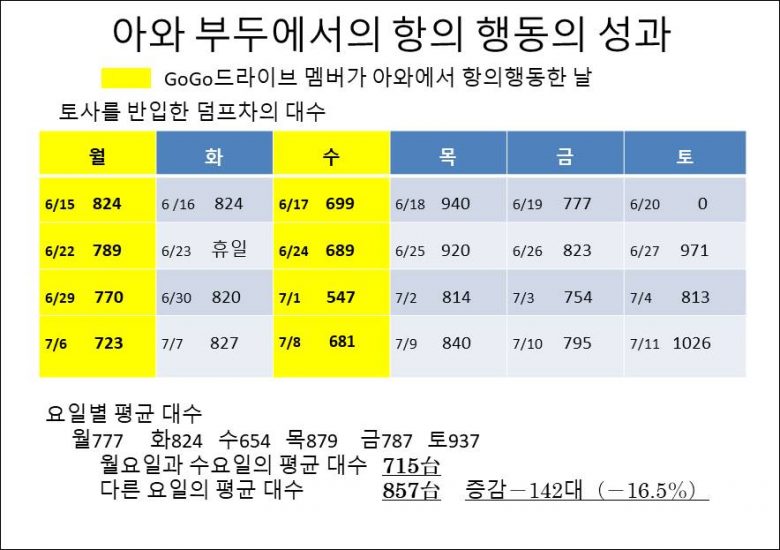 덤프트럭의 토사 반입을 줄이려고 아와 부두 앞을 천천히 운전하는 ‘GoGo드라이브’의 성과가 숫자로 나왔다. GoGo드라이브 멤버가 행동하는 월요일과 수요일에 반입한 차량 대수는 평균 715대, 다른 요일에는 평균 857대로 142대(약16.5%)나 줄었다. 불과 10명 정도의 멤버로 토사 반입 작업을 많이 늦춰져 있다. 물론 부두 입구와 출구에서 끈질기게 항의하는 시민들의 활동도 반입을 지연시키고 있을 것이다. 자신을 가져도 된다.