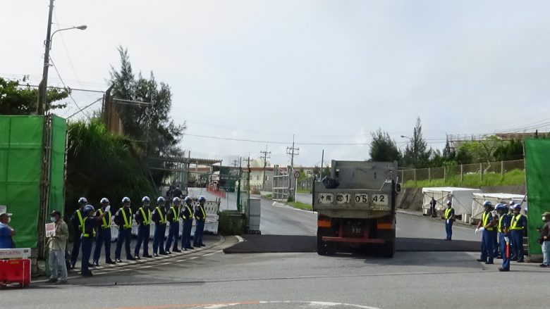 태풍 8 호의 영향으로 오키나와 방위국은 2 일간 공사를 중단했지만26 일 이후에는 매일 수십 대가 자재를 반입했다. 25 일에는 캠프 슈워브 미군기지에 처음으로 코로나19 확진자 2 명이라는 보도가 나왔다. 하지만 방위국은 공사를 계속한다는 방침을 즉시 밝혔다. 오키나와평화운동센터 의장 야마시로 히로지(山城博治) 씨는 “미군이 현내 코로나 감염 확대의 한 원인이다. 공사 계속은 있어서는 안되는 일이다. 코로나19가 진정될 때까지 모든 기지를 폐쇄해야 한다”고 말했다.
