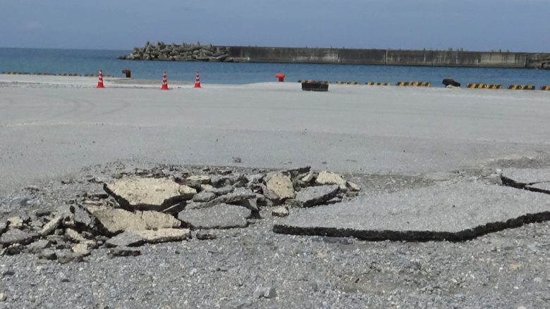 태풍 8 호로 인해 잔교의 콘크리트가 일부 벗겨졌다. 높은 파도가 부두까지 밀려 그렇지 않아도 토사 운반으로 손상된 콘크리트를 뗀 것으로 보인다. 여기 시오카와 항은 2 년 전에도 태풍으로 안벽이 손상되어 반출 작업이 몇 달간 중단된 바가 있다. 이번 상태라면 선박 접안에 지장을 안 주기 때문에 반출 작업은 가능할 것으로 보인다
