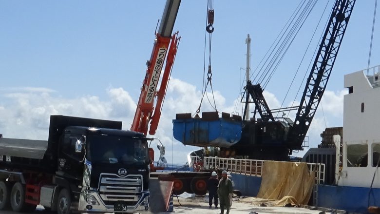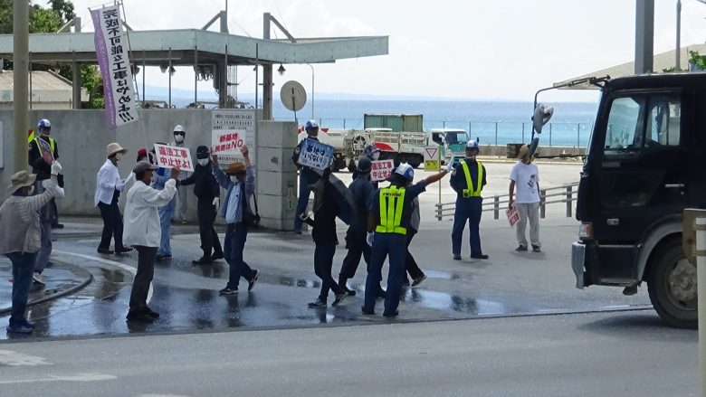 오키나와 평화시민연락회의 멤버들 30명이 출구와 입구로 나뉘어 덤프차량을 향해 항의를 목소리를 높였다. 임시보관장에 토사가 거의 꽉 차 반입은 통상보다 한시간 빠른 18시반에 종료했다. 해상에서는 카누팀 8정이 가교밑에 친 로프에 카누를 묶어 운반선의 출항에 저항하였다. 해상보안청에 의해 배재되기 까지 한시간 가까이 출항을 지연시켰다. 덤프차 652대분의 토사가 운반선 2척에 실려 오우라만을 향해 출항했다.