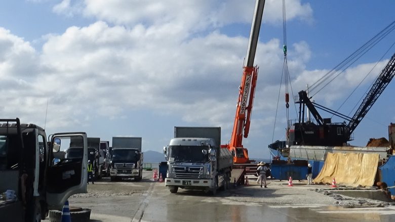 왜 그런지 능률이 좋지 않은 크레인 선박에 적재. 매일 감시하고 있는 T 씨에게 물어보니 “월요일은 우루마시의 멤버가 많이 왔고, 기동대도 시간이 걸리니까 일부러 크레인 선박에 적재하는 게 아닐까”라고. 크레인 선박에는 바지선 3분의 1대 분량의 토사밖에 실을 수 없다. 따라서 덤프 트럭이 줄지어 오는 것도 없으니 항의 행동을 하기 애매한 상황이란 건 확실하다. 이날 토사는 133대 분이 간신히 적재되었다.