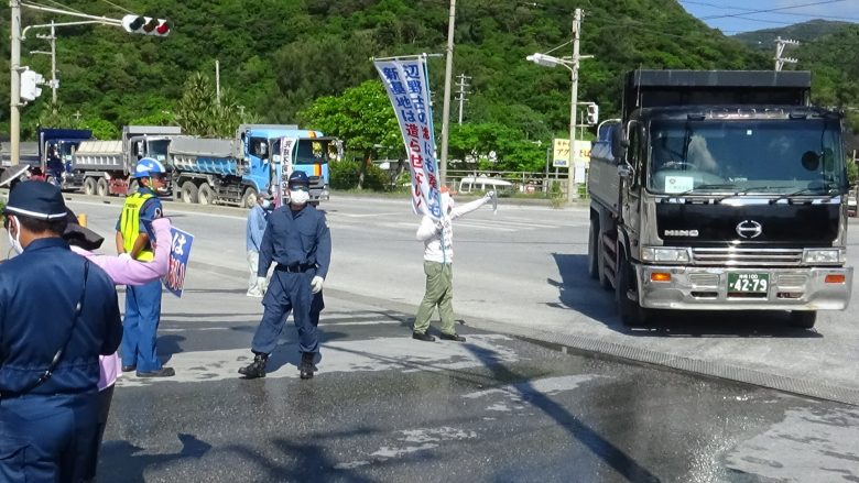 오늘도 좋은 날씨. 양산을 쓰고 연좌 시위를 하는 사람이 많았다. 오전오후 세 차례에 걸쳐 약 30명이 연좌 시위, 항의 행동의 뜻을 표했다. 기동대의 진압 뒤에도 토사 반입 차량을 향해 “바다에 시멘트는 필요 없다” “위법 공사 당장 중지해라” 등 목소리를 높였다. 176대가 자재를 반입했다.
