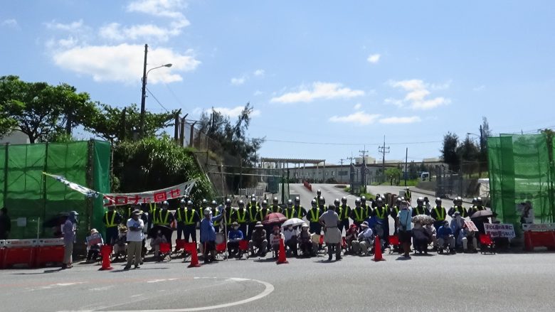 ‘시마구루미∙우루마(島ぐるみ・うるま)’의 멤버들이 중심이 되어 출입구에서 항의 행동을 이어나갔다.
