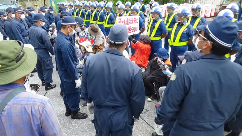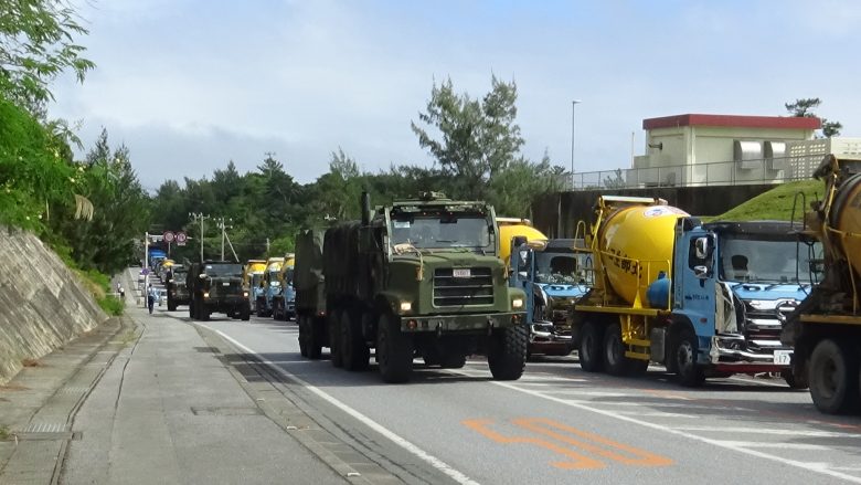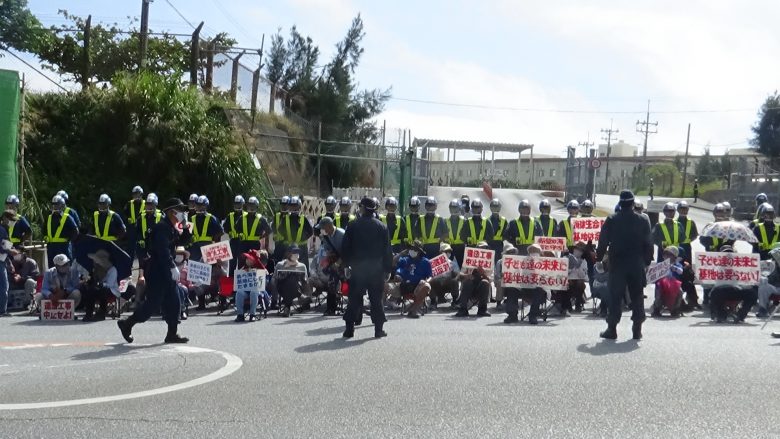 여름을 연상시키는 것 같은 30도에 가까운 더위 속에 나하 시마구루미 투쟁 멤버들 40여명이 바닥에 앉아 농성하며 항의의 소리를 높였다. 미군 신형코로나바이러스 감염자가 발생해도 훈련을 그만 둘 생각은 전혀 없는 것 같다.