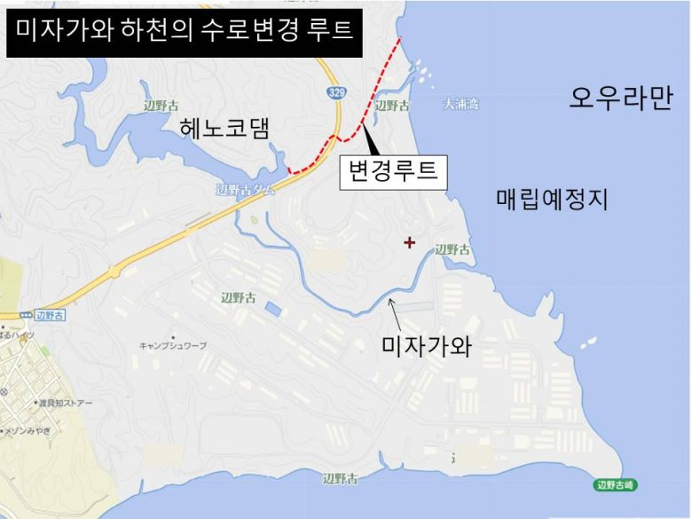 오키나와방위국이 오우라만의 매립을 향해 미자가와 하천의 수로변경을 위한 시추조사를 착수한 것이 3일 드러났다. 미자가와 하천의 하구가 매립지에 접해 있기 때문에 헤노코댐으로부터의 수로를 전면적으로 방향을 바꾸려고 하는 것이 목적이다. 수원지인 헤노코댐과 미자가와 하천은 나고市의 관리하에 있어, “신기지반대”를 공약으로 내걸고 있던 이나미네 스스무 前 시장은 수로변경을 인정하지 않겠다는 방침이었다. 그로 인해, 방위국은 시의 허가가 불필요한 공법으로 변경한 셜계서를 제출했으나, 나카이마 현지사의 승인이 내지지 않아, 2014년 11월에 신청을 취하하였다.
