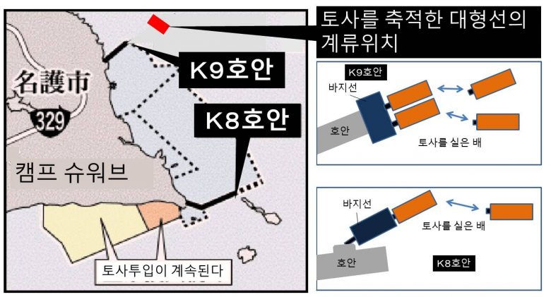 현재까지의 토사 투입량은 전체의 약 3.5%도 채 안된다. 2년에 걸쳐 이 수치이면 공사완성 기일 13년에는 전혀 도달할 기미가 없다. 더우기 헤노코쪽의 매립을 서둘러도 연약지반이 펼쳐지는 오우라만측은 그대로 남아 있어 전체적인 공사기간 단축으로 이어지지 않는다. 그래도 스가 요시히데 수상이 말하듯이 “눈에 보이는 변화” 로 공사를 추진, 신기지건설이 순조로이 진행되고 있는 것만 같은 인상을 주겠다는 속셈이 역력하다.