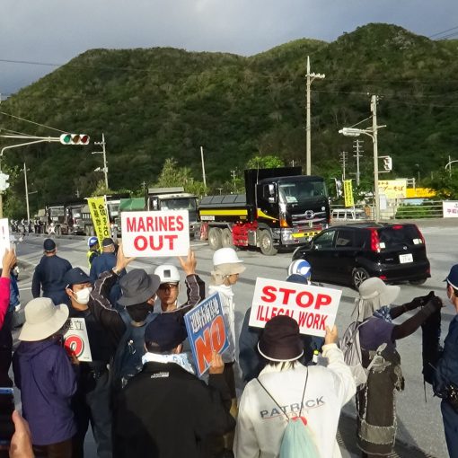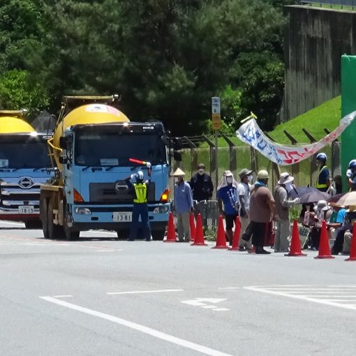 70명 가까이가 게이트 앞에 연좌농성, 항의의 목소리를 높였다. 모토부 시마구루미 회의의 중심 멤버인 타카가키 기조(高垣喜三)씨(71) 가 어젯밤 급사한 소식을 접하여, 그를 잘 아는 분들에서 애도의 스피치가 잇따랐다.