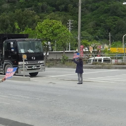 오키나와 평화 시민 연락회 멤버들 약 20여 명이 부두 출입구에 나뉘어 항의를 계속했다. 공안위원회에 민원을 제기한 탓인지 기동대 H중대장의 과잉 규제가 진정되고 3개월 전의 평온한 상태로 돌아갔다. 입구나 횡단보도를 천천히 걷는 등, 덤프가 줄지어 구내에 들어가지 못하게 교묘한 항의 행동을 계속했다. 반입은 저녁 7시 50분까지 계속됐고 덤프 952대 분량이 임시 보관소에 잔뜩 쌓여있었다. 운반선 3척에 853대분량이 실려 출항했다.